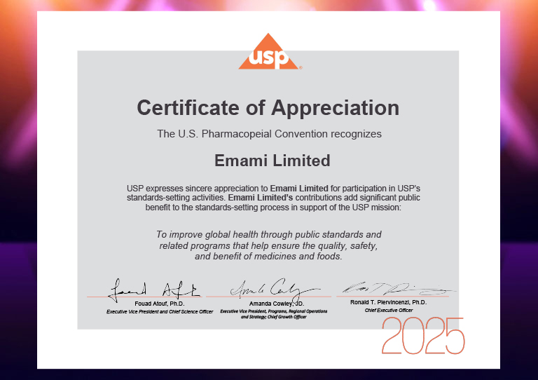 • Emami Limited has received an appreciation letter from the United States Pharmacopeia (USP) for developing the monograph on Shatavari (Asparagus racemosus) roots, powder, and extract. USP is a globally recognized, non-profit scientific organization that establishes official quality standards for medicines, dietary supplements, and healthcare products. This reflects Emami's unwavering commitment to scientific excellence, robust quality standards, and global regulatory harmonization in the field of traditional and herbal medicines.